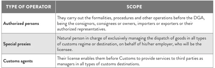 The Customs Law recognizes Customs Operators5 who must have a license issued by the corresponding authorities or an enabling title to exercise their functions6.