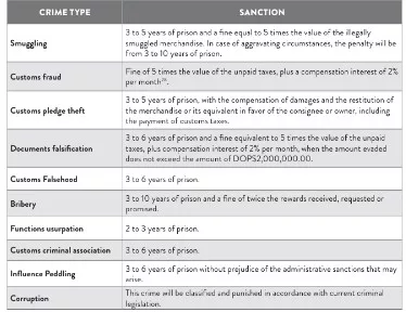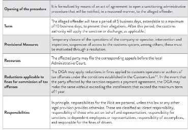 3. Tax and customs offenses: customs tax offenses are any action or omission of non-compliance with the tax obligations from which the responsibility for the payment of the tax debt and/or for the corresponding administrative or pecuniary sanctions arises29. Customs offenses, on their behalf constitute violations or transgressions of the administrative order. Any customs or customs tax offense will be sanctioned with a fine, which will accrue interest on the total sum and a moratorium according to the failure of the customs operator to comply with its obligation.