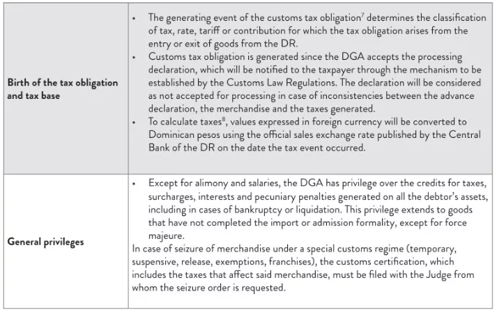 The Customs Law establishes the legal framework of the customs regime in the DR to facilitate and streamline foreign trade operations, control and supervise the passage of goods through the customs territory, to collect the established taxes, to pursue illicit customs and foreign trade behaviors, to develop and manage the execution of legislation and international treaties of which the country is a signatory; and to generate customs and foreign trade statistics.