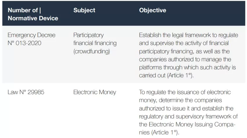 Even though the development of Fintech companies is increasing in Peru, there has not yet been a specific regulatory development for them, which would allow for a direct and precise definition of the regulatory framework applicable to this sector.